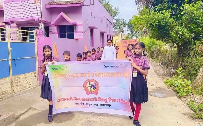 चक्रधरपुर | पंपरोड स्थित पद्मावती जैन सरस्वती शिशु विद्या मंदिर, शत्रुघ्न नगर में हिन्दू नव वर्ष के अवसर पर भव्य प्रभात फेरी निकाली गई। प्रभात फेरी विद्यालय से प्रारंभ होकर इतवारी बाजार होते हुए जलाराम मेडिकल तक गई और पुनः विद्यालय परिसर में समाप्त हुई। इस दौरान “नव वर्ष मंगलमय हो” के जयघोष के साथ सभी को नव वर्ष की शुभकामनाएँ दी गईं।