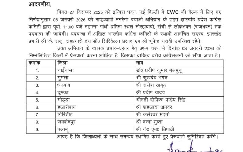 चाईबासा : कांग्रेस पार्टी की राष्ट्रव्यापी मनरेगा बचाओ अभियान के तहत शनिवार, 03 जनवरी 2026 को दोपहर 12:30 बजे कांग्रेस भवन, चाईबासा में एक प्रेस वार्ता आयोजित की जाएगी। प्रेस वार्ता को कांग्रेस के पूर्व प्रदेश अध्यक्ष एवं पूर्व राज्यसभा सांसद डॉ. प्रदीप कुमार बलमुचू संबोधित करेंगे। इस अवसर पर मनरेगा से जुड़े मुद्दों पर कांग्रेस का पक्ष रखा जाएगा। प्रेस वार्ता में समाचार संकलन हेतु प्रिंट, इलेक्ट्रॉनिक एवं डिजिटल मीडिया के प्रतिनिधियों को आमंत्रित किया गया है।