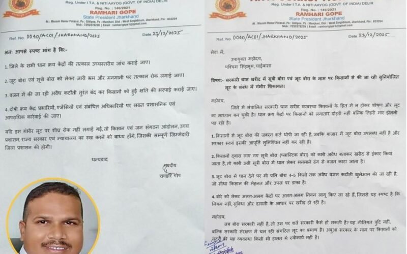 चाईबासा : पश्चिम सिंहभूम जिले में सरकारी धान खरीद व्यवस्था किसानों के लिए राहत नहीं, बल्कि शोषण का जरिया बनती जा रही है। धान क्रय केंद्रों पर जूट बोरा और सूत्री बोरा को लेकर किसानों से मनमानी, अवैध शर्तें और वजन कटौती किए जाने के गंभीर आरोप सामने आए हैं।